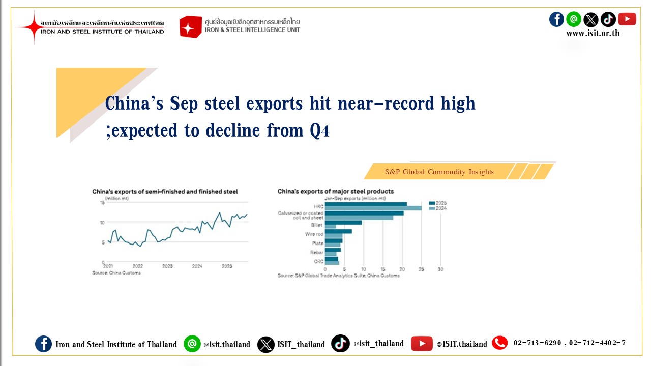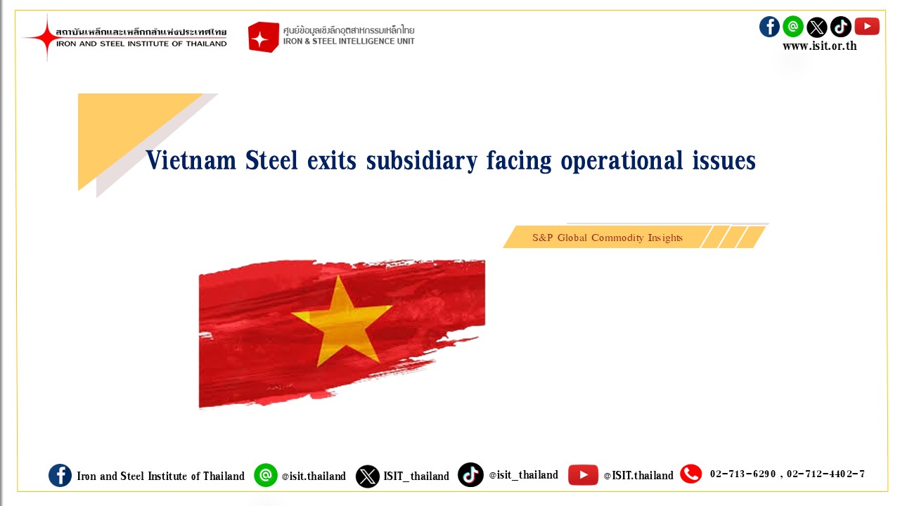 The information in the above report, publication and website has been obtained from sources believed to be reliable. However, Iron & Steel Institute of Thailand does not guarantee the accuracy, adequacy or completeness of the information. Any opinions or forecasts regarding future events may differ from actual events or results. In addition, Iron & Steel Institute of Thailand reserves the right to make changes and corrections to the information, including any opinions or forecasts, at any time without notice.