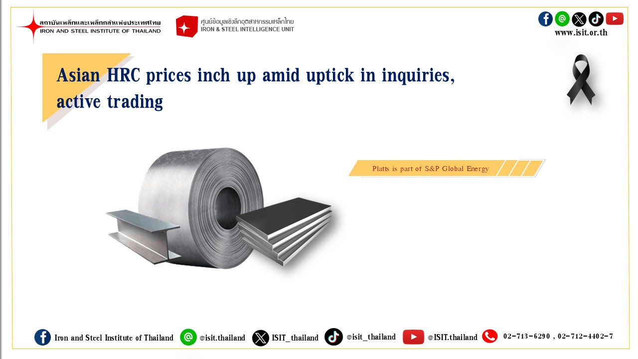 Platts ประเมินบิลเล็ต 5SP ขนาด 130 มม. ราคาเพิ่มขึ้น $1/ตัน มีราคาที่ $464/ตัน CFR ในเอเชียตะวันออกเฉียงใต้ ในขณะที่บิลเล็ตนำเข้า 3SP ขนาด 150 มม. ของจีน โดยราคาประเมินเพิ่มขึ้น $2/ตัน มีราคาที่ $375/ตัน CFR ประเทศจีน