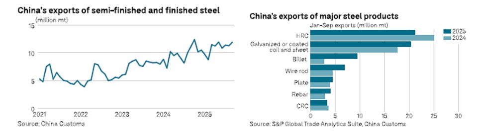 การส่งออกเหล็กกึ่งสำเร็จรูปและเหล็กสำเร็จรูป (semi-finished and finished steel) ของจีน ในเดือนกันยายนแตะระดับสูงสุดในปี 2025 โดยเป็นปริมาณรายเดือนสูงสุดเป็นอันดับสองในประวัติศาสตร์ ตามข้อมูลล่าสุดของกรมศุลกากร